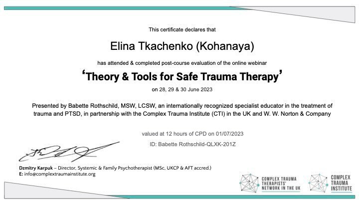 - Обучение у Баббет Росчайлд «Теория и инструменты для безопасной травмотерапии»