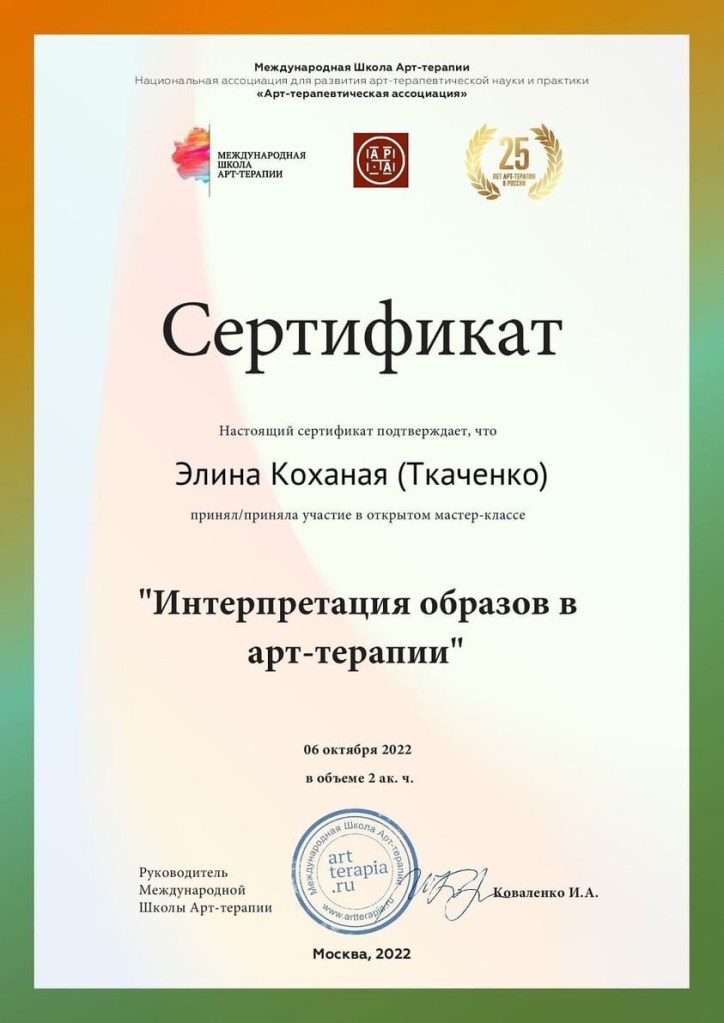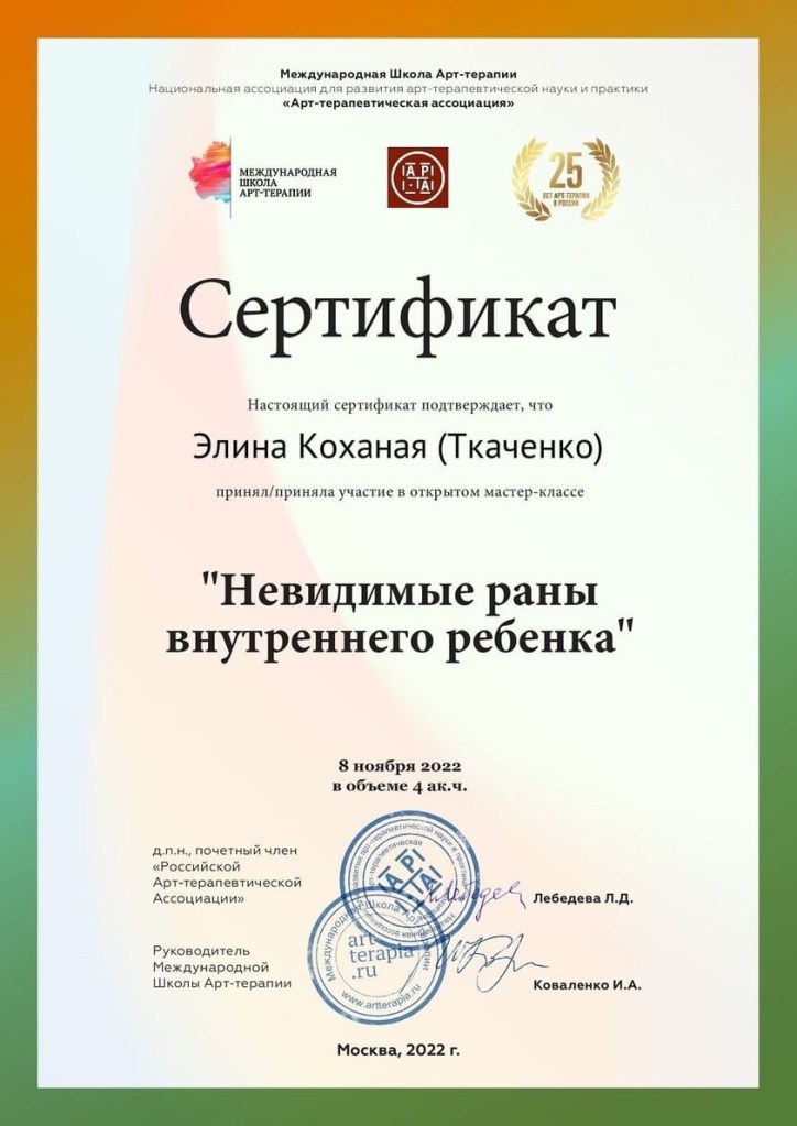- Повышение квалификации в АНО ДПО «Академии искусств Игоря Бурганова»по дополнительной профессиональной программе «Современные технологии в педагогике: арт-педагогика и педагогическая арт-терапия».